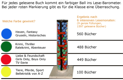 Für jedes gelesene Buch durften die Kinder einen farbigen Ball in ihr Klassen-Lesebarometer werfen. Je nach Thema hatte der Ball eine andere Farbe. Welche gewinnt wohl?